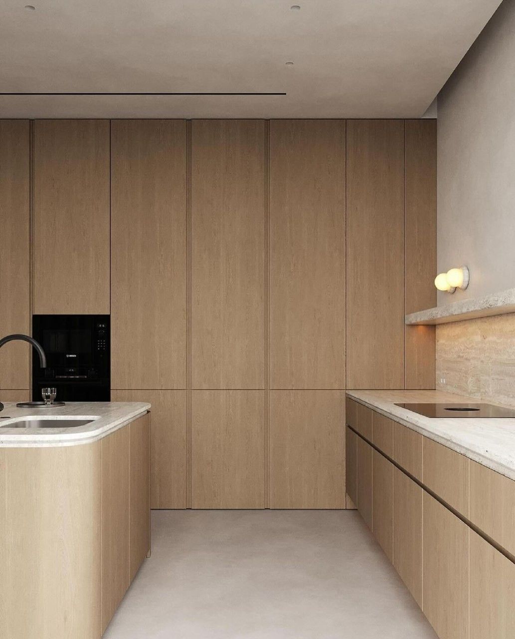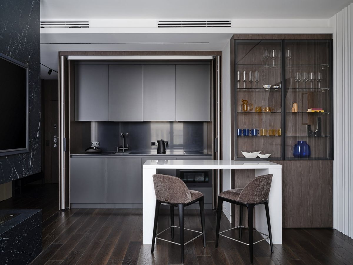 Если вы любитель минимализма и вам близка идея чистых линий, спокойных форм и отсутствия визуального шума, то скрытая кухня — именно то решение. Она помогает поддерживать ощущение простора и чистоты, оставляя интерьер визуально целостным.