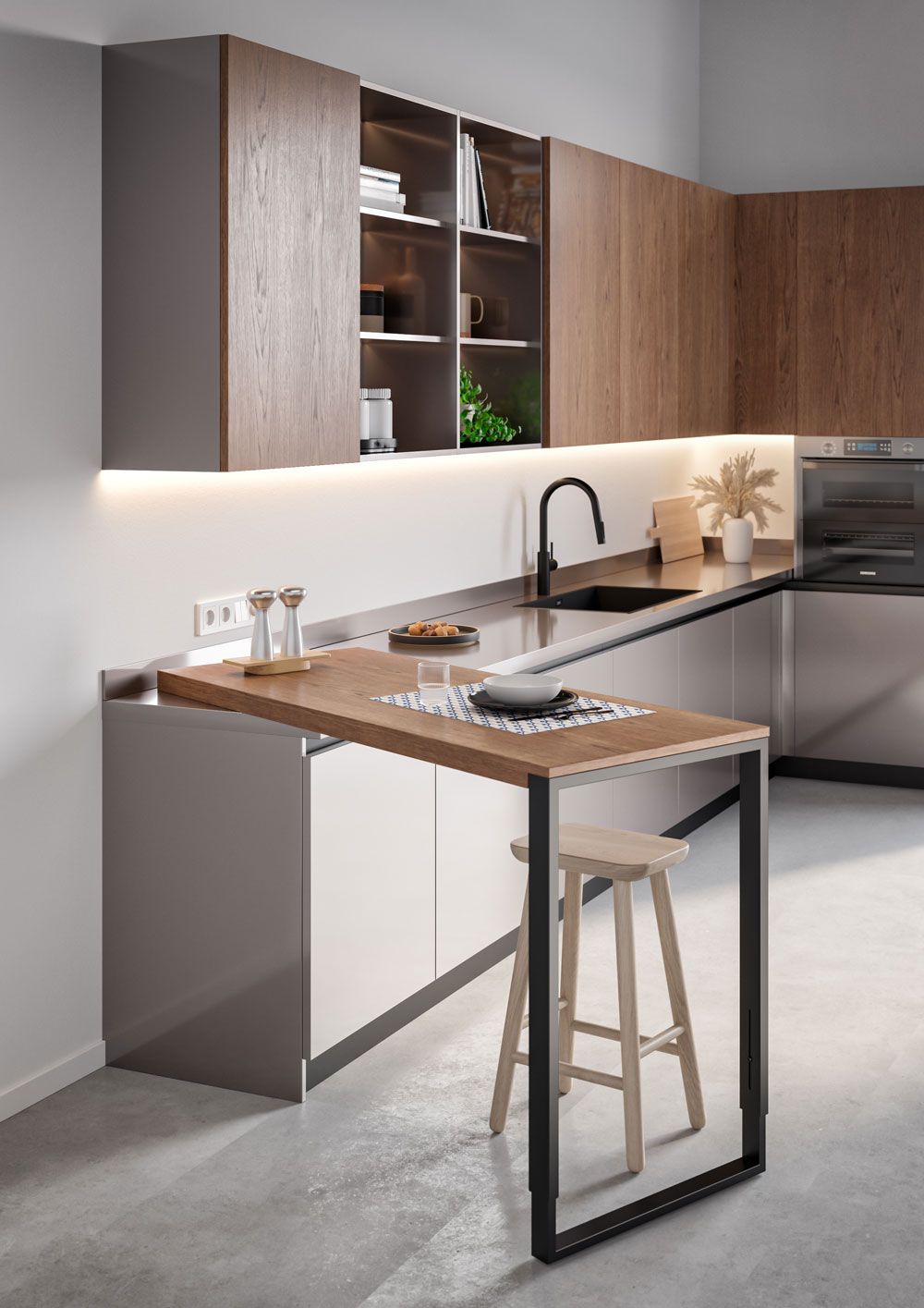 Даже в просторных квартирах и домах кухня нередко объединяется с гостиной или рабочей зоной. Здесь скрытый гарнитур позволяет трансформировать помещение под сценарий: утром вы работаете за ноутбуком, вечером принимаете гостей и никто не видит рабочую поверхность с техникой.