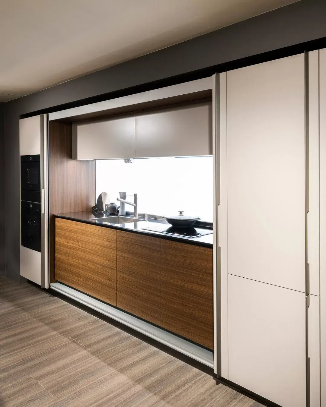 Это, грубо говоря, стена на рельсах. Представьте себе крупные панели (деревянные, стеклянные), которые сдвигаются в сторону, открывая или закрывая кухню. В закрытом виде вы видите аккуратную плоскость без намека на бытовую технику, как будто это часть гостиной. В открытом виде — это полноценная рабочая зона.
