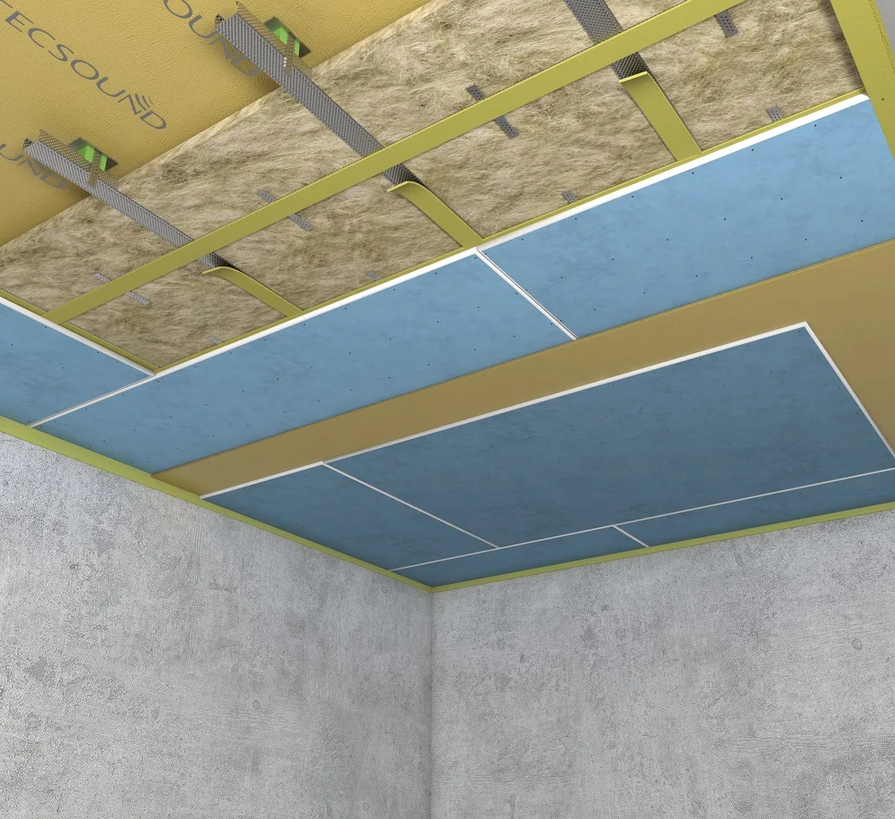 Бескаркасный способ. Используются готовые изоляционные панели, которые крепятся непосредственно к потолку через специальные виброузлы (крепеж с виброгасящими элементами). Затем панельная конструкция обшивается снизу листами акустического гипсокартона, поверх которого монтируется дополнительный слой гипсокартона для создания ровной поверхности под финишную отделку.