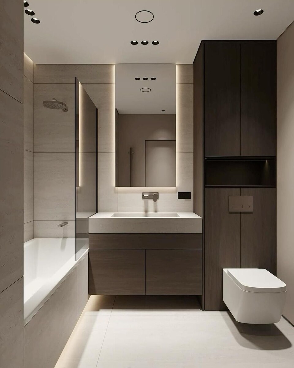 - В просторных ванных стоит продумывать зоны хранения заранее. Встроенные ниши, большие пеналы, отдельные шкафы. Но важно не перегружать интерьер, ведь мебель должна быть частью пространства, а не занимать его.