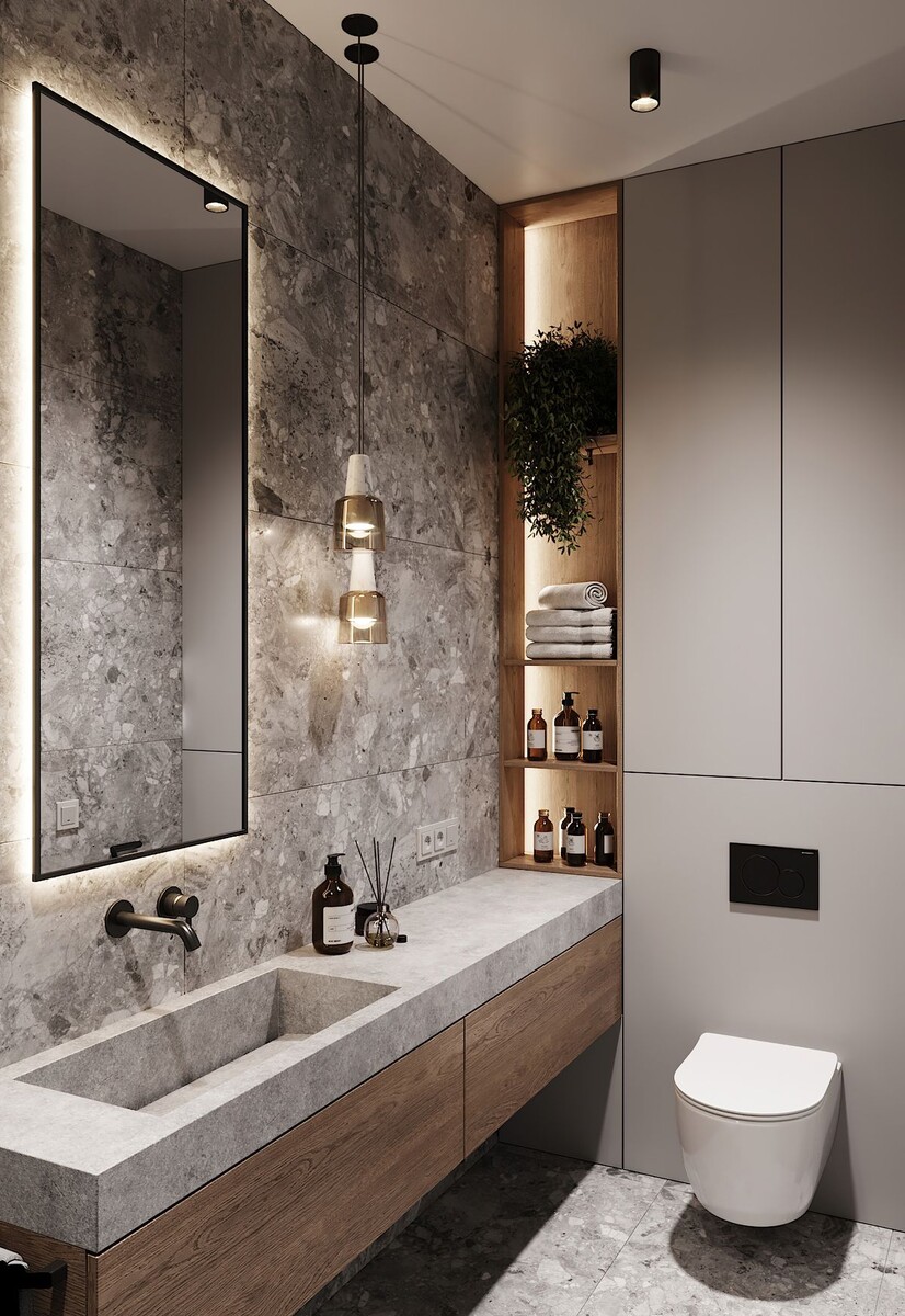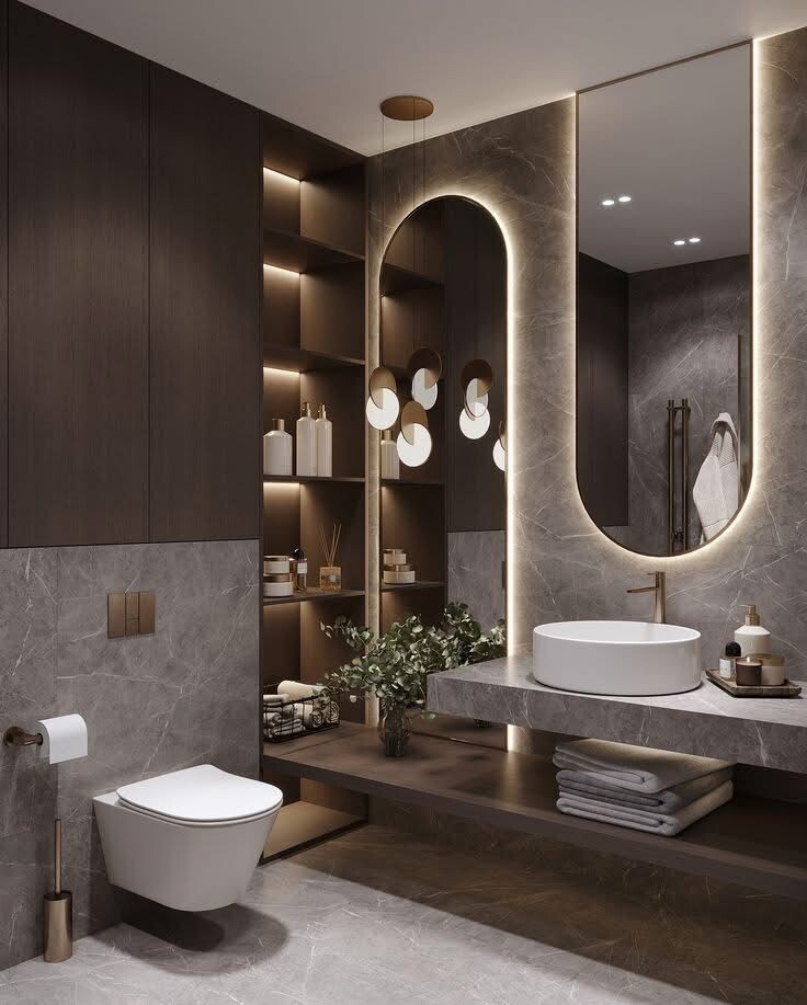 Камень в ванной всегда смотрится статусно и благородно. Его используют для столешниц, полок или облицовки фасадов. Особенно эффектно выглядят решения, когда отделка мебели и стен выполнена из одного материала и создается монолитный образ, который словно собирает интерьер воедино. Такие элементы не только практичны, но и становятся самостоятельными акцентами, которые подчеркивают характер пространства.